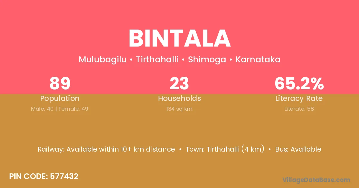 Tirthahalli (4 km) is the nearest town to Bintala village for major economic activities and is located approximately 4 km away.