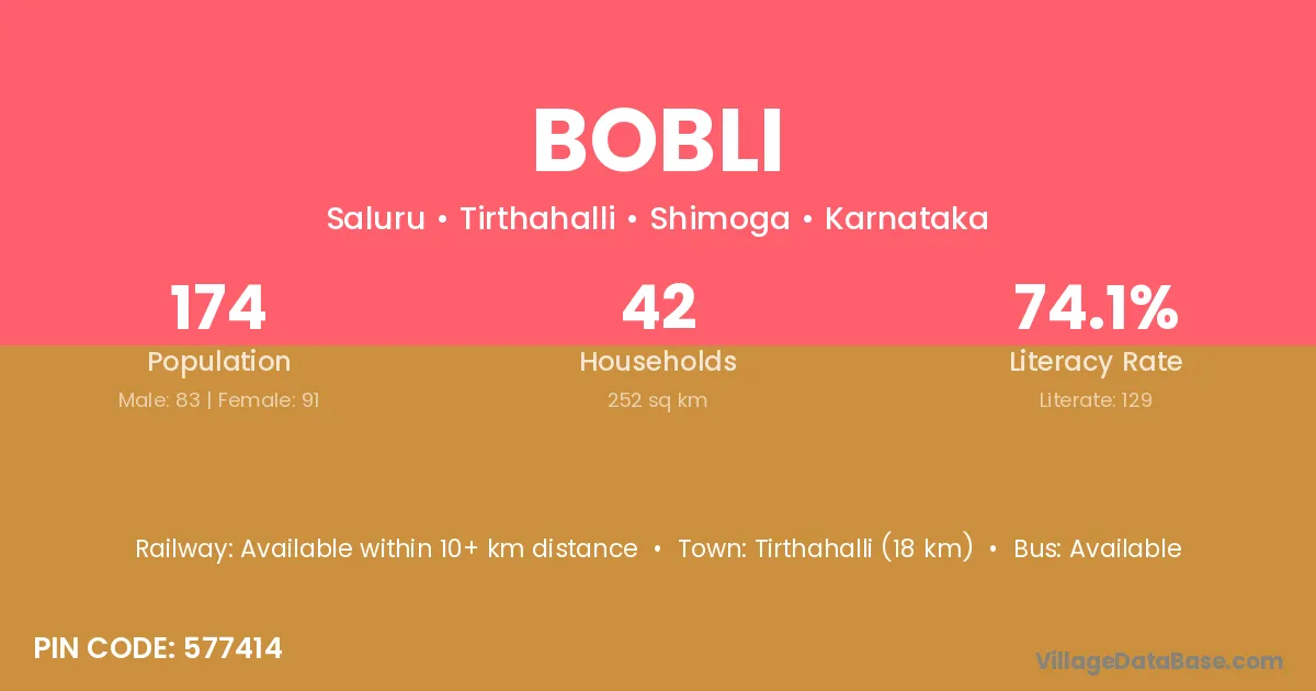 Tirthahalli (18 km) is the nearest town to Bobli village for major economic activities and is located approximately 18 km away.