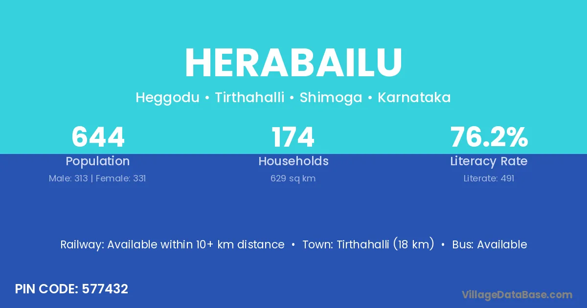 Tirthahalli (18 km) is the nearest town to Herabailu village for major economic activities and is located approximately 18 km away.