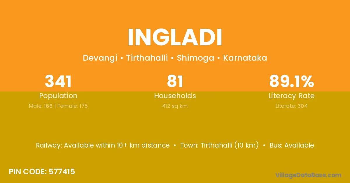 Tirthahalli (10 km) is the nearest town to Ingladi village for major economic activities and is located approximately 10 km away.