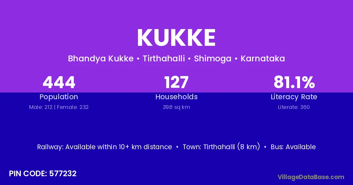 Kukke village has a total population of 444 people, of which 212 are males and 232 are females.