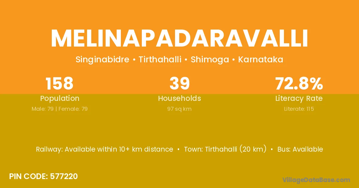 Tirthahalli (20 km) is the nearest town to Melinapadaravalli village for major economic activities and is located approximately 20 km away.