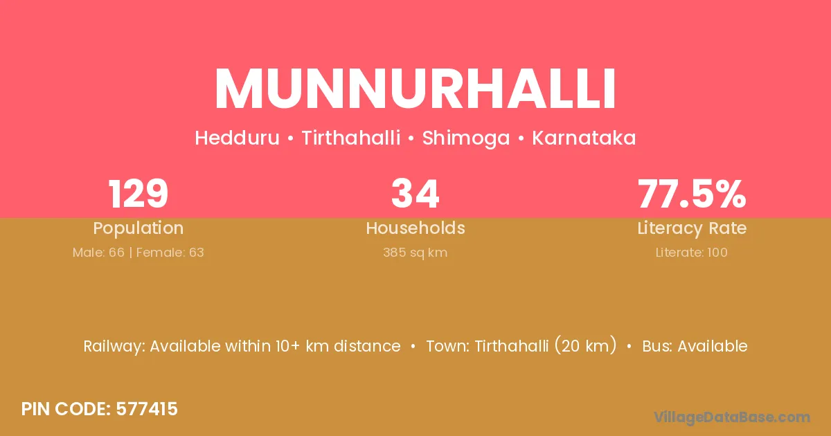 Tirthahalli (20 km) is the nearest town to Munnurhalli village for major economic activities and is located approximately 20 km away.