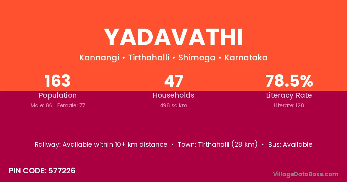Tirthahalli (28 km) is the nearest town to Yadavathi village for major economic activities and is located approximately 28 km away.