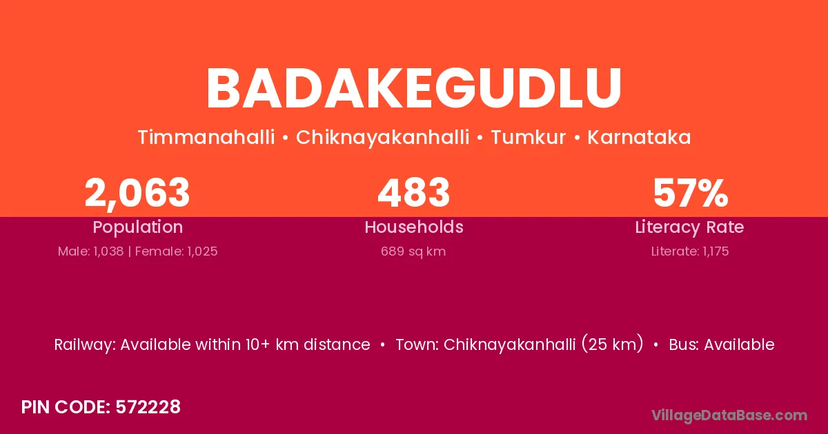 Chiknayakanhalli (25 km) is the nearest town to Badakegudlu village for major economic activities and is located approximately 25 km away.