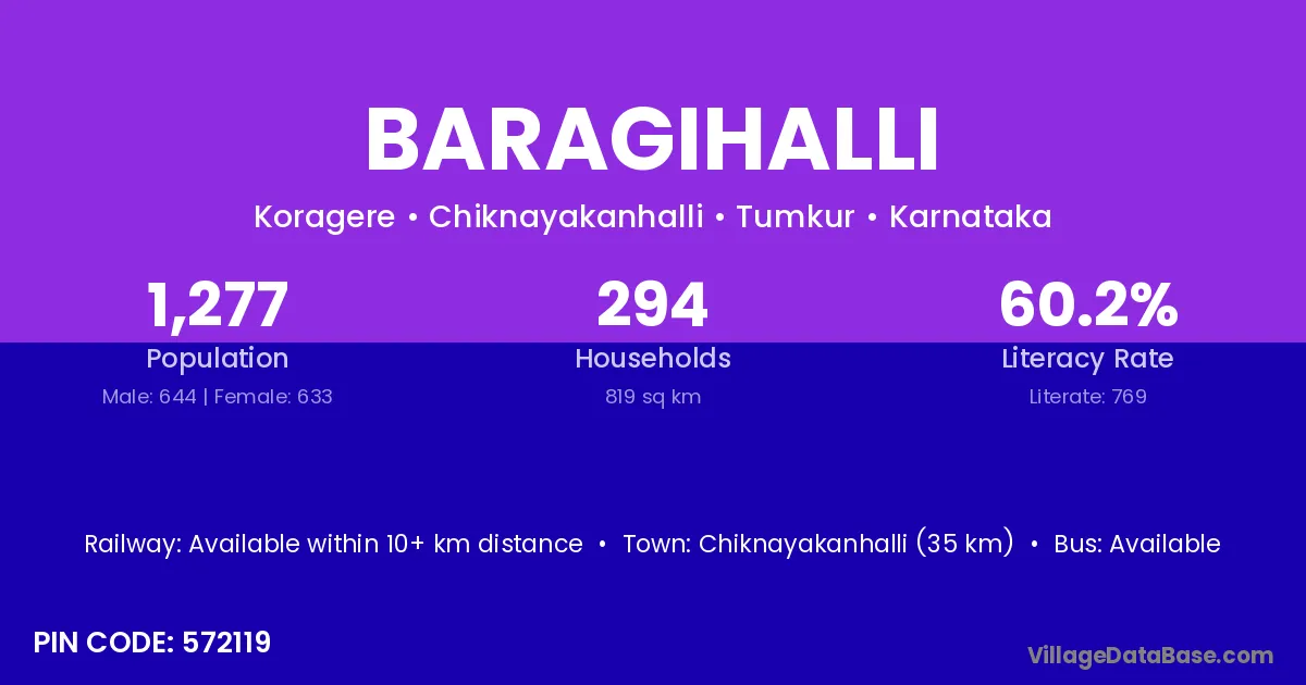 Chiknayakanhalli (35 km) is the nearest town to Baragihalli village for major economic activities and is located approximately 35 km away.
