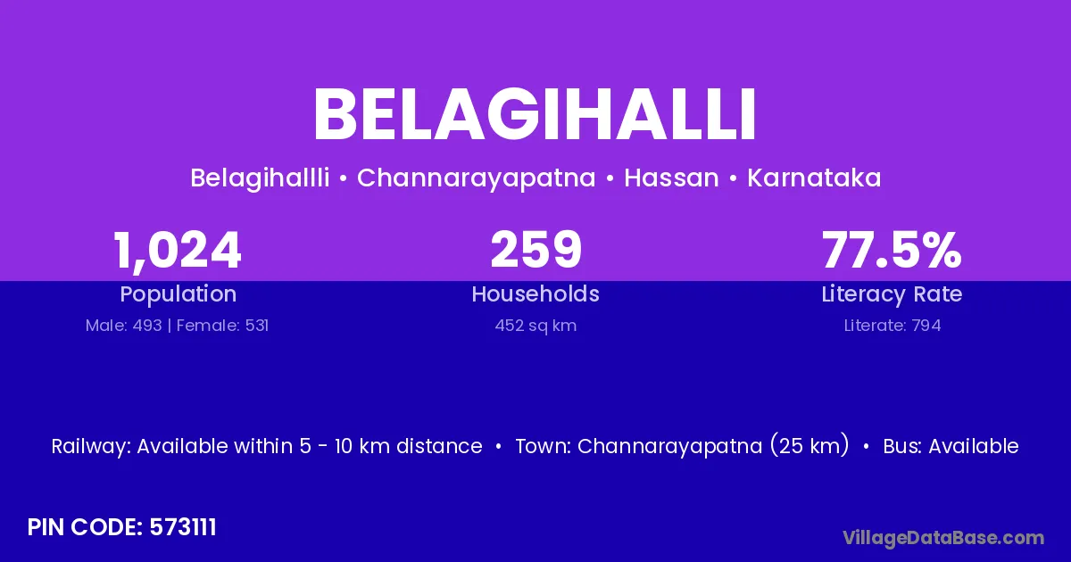 Chiknayakanhalli (20 km) is the nearest town to Belagihalli village for major economic activities and is located approximately 20 km away.