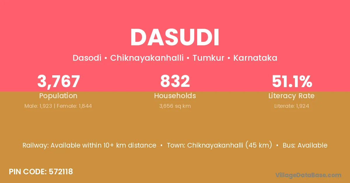 Chiknayakanhalli (45 km) is the nearest town to Dasudi village for major economic activities and is located approximately 45 km away.