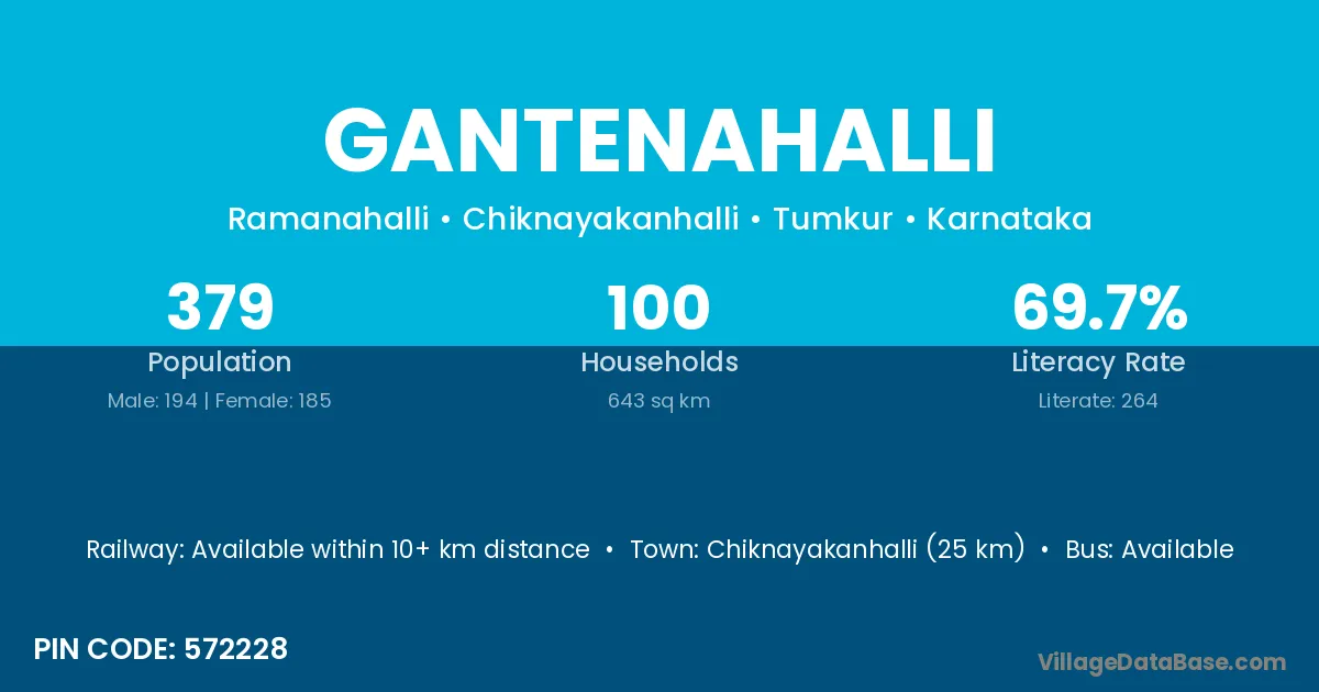 Gantenahalli village has a total population of 379 people, of which 194 are males and 185 are females.