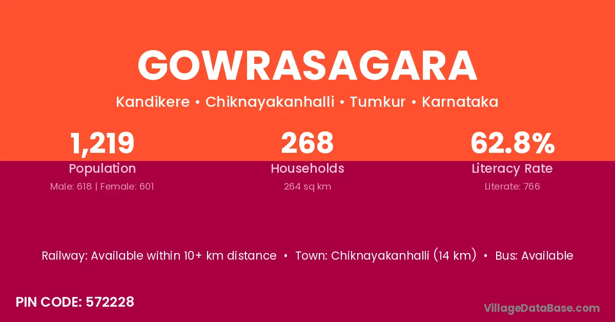 Gowrasagara village has a total population of 1,219 people, of which 618 are males and 601 are females.