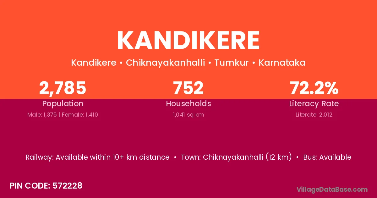 Chiknayakanhalli (12 km) is the nearest town to Kandikere village for major economic activities and is located approximately 12 km away.