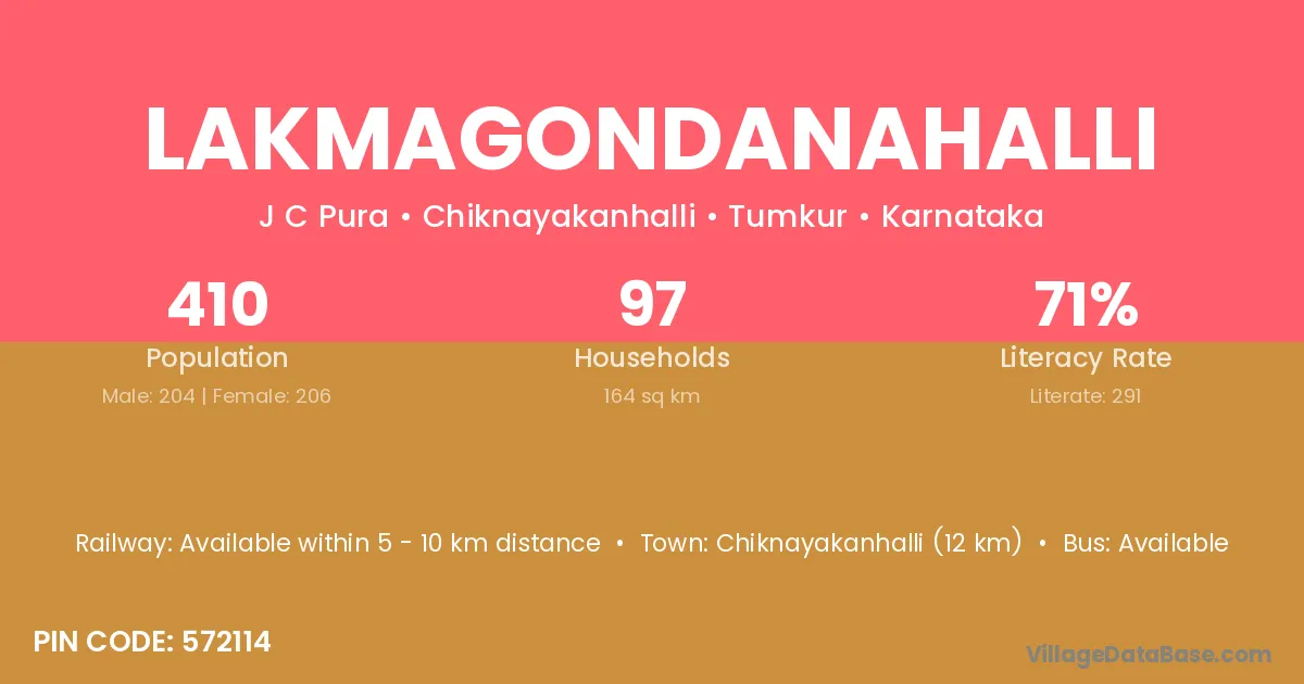 Lakmagondanahalli village has a total population of 410 people, of which 204 are males and 206 are females.