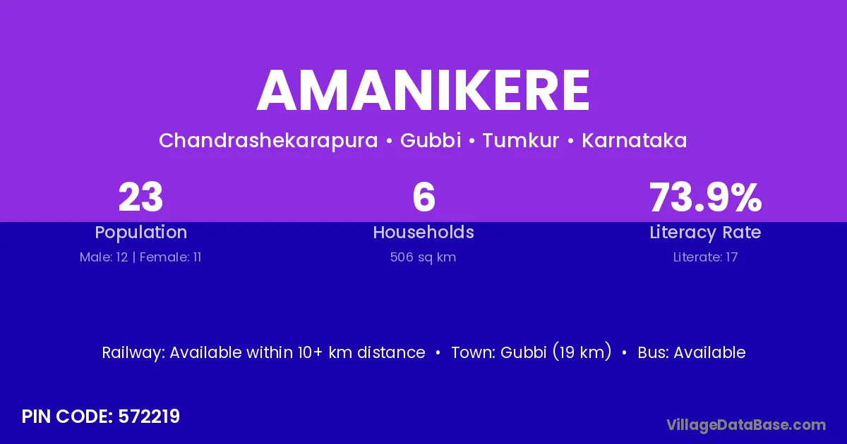 Gubbi (19 km) is the nearest town to Amanikere village for major economic activities and is located approximately 19 km away.