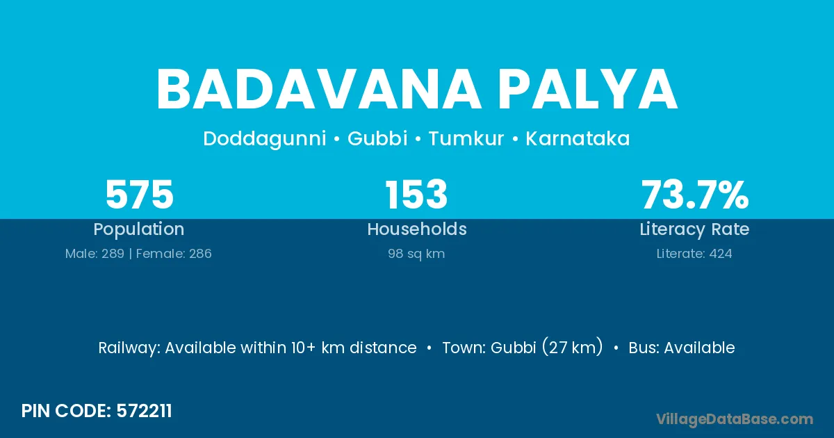 Gubbi (27 km) is the nearest town to Badavana Palya village for major economic activities and is located approximately 27 km away.