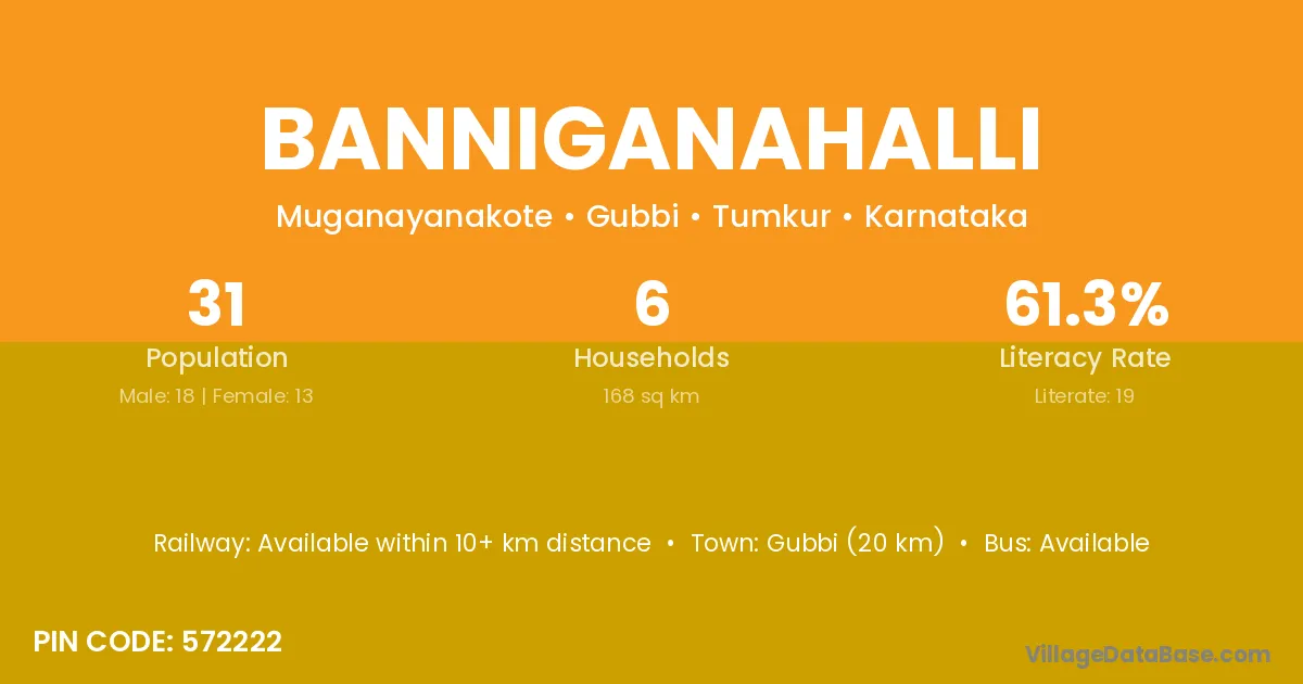 Gubbi (20 km) is the nearest town to Banniganahalli village for major economic activities and is located approximately 20 km away.