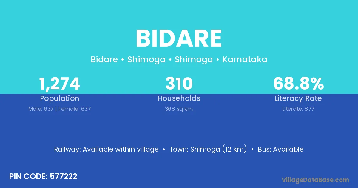Gubbi (11 km) is the nearest town to Bidare village for major economic activities and is located approximately 11 km away.