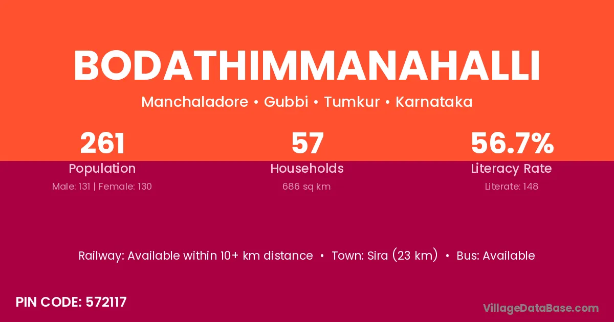 Bodathimmanahalli village has a total population of 261 people, of which 131 are males and 130 are females.