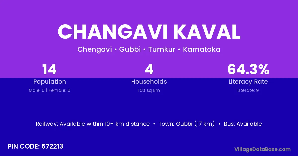 Gubbi (17 km) is the nearest town to Changavi Kaval village for major economic activities and is located approximately 17 km away.