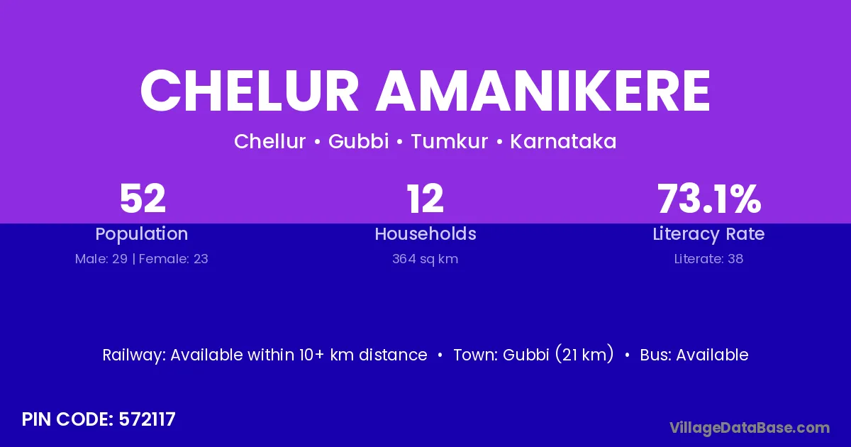 Gubbi (21 km) is the nearest town to Chelur Amanikere village for major economic activities and is located approximately 21 km away.