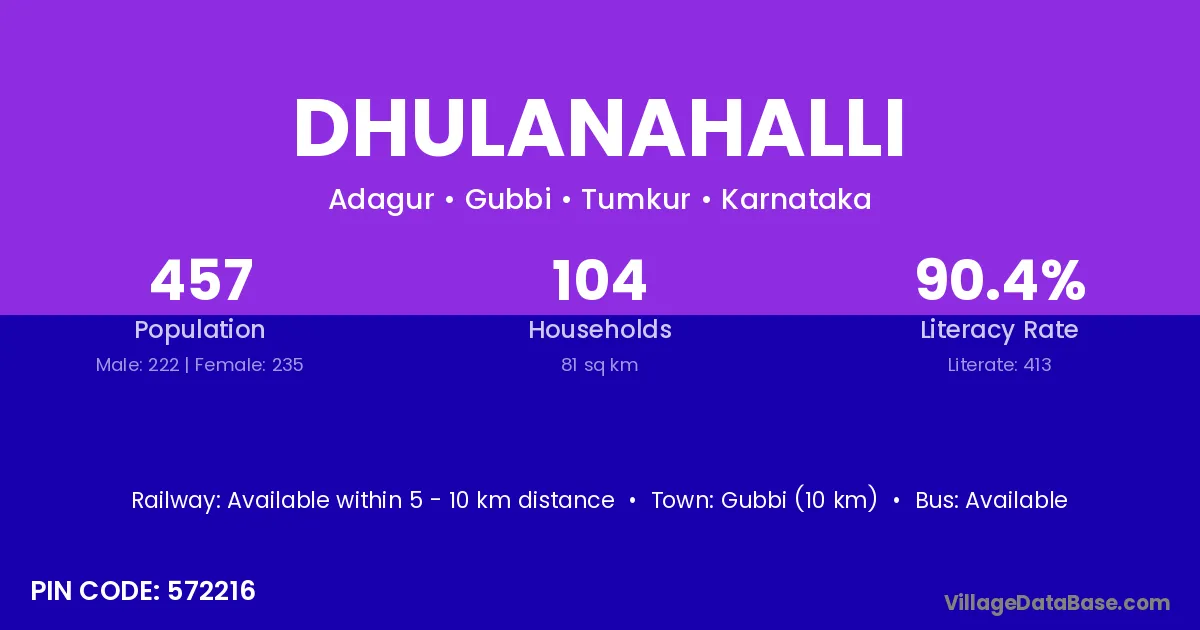 Gubbi (10 km) is the nearest town to Dhulanahalli village for major economic activities and is located approximately 10 km away.