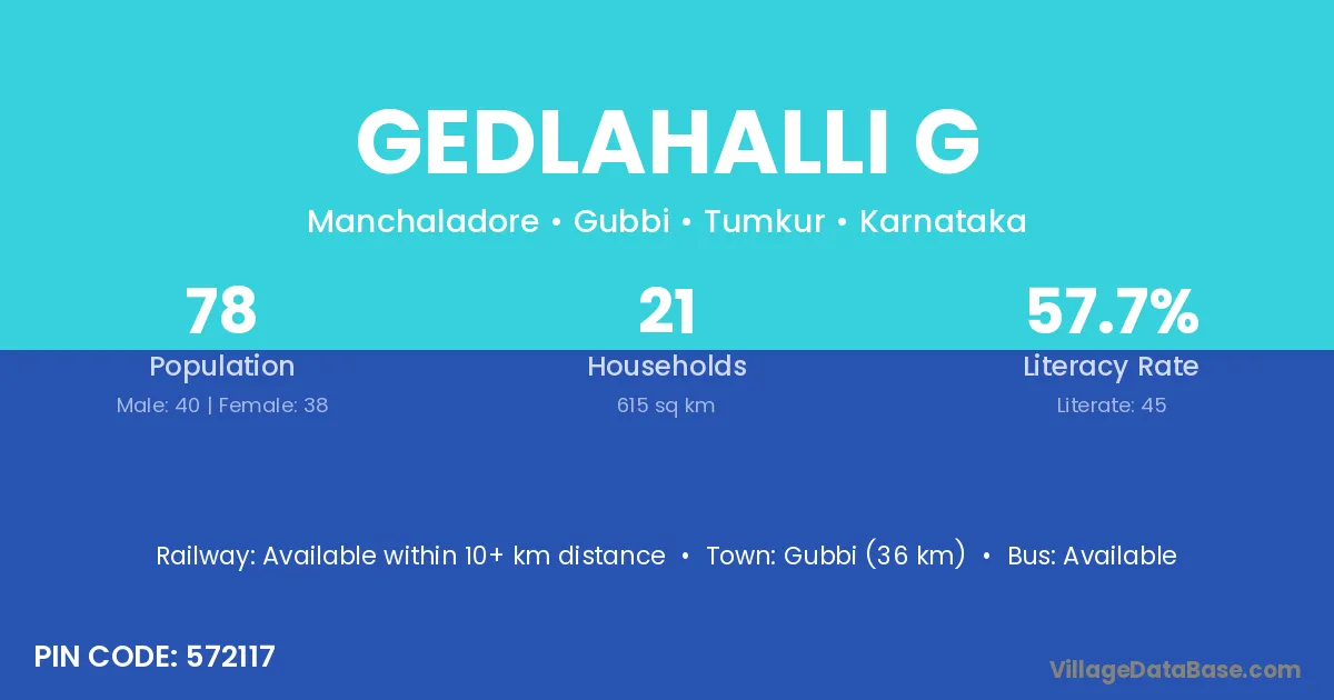Gubbi (36 km) is the nearest town to Gedlahalli G village for major economic activities and is located approximately 36 km away.