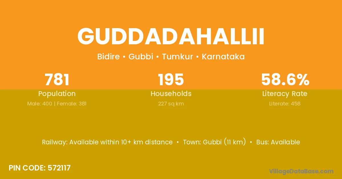 Gubbi (11 km) is the nearest town to Guddadahallii village for major economic activities and is located approximately 11 km away.