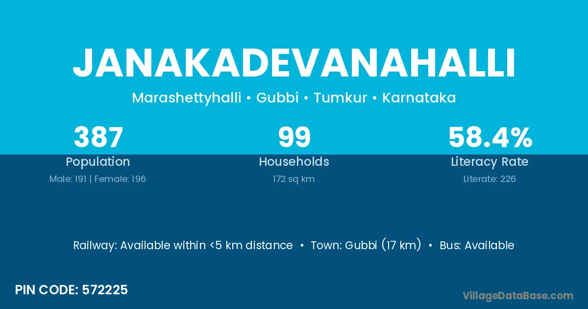 Gubbi (17 km) is the nearest town to Janakadevanahalli village for major economic activities and is located approximately 17 km away.