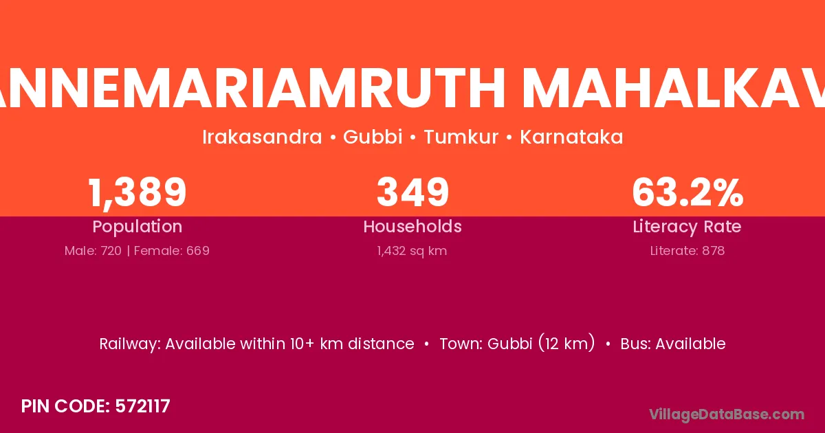 Gubbi (12 km) is the nearest town to Mannemariamruth Mahalkaval village for major economic activities and is located approximately 12 km away.