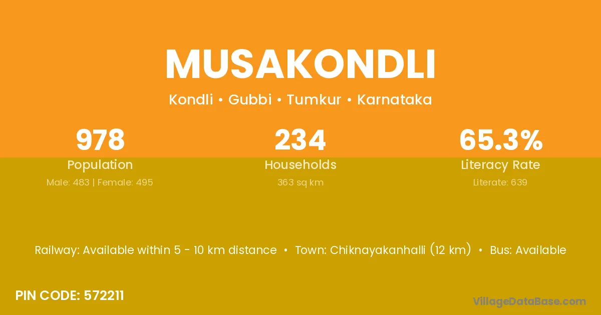 Chiknayakanhalli (12 km) is the nearest town to Musakondli village for major economic activities and is located approximately 12 km away.