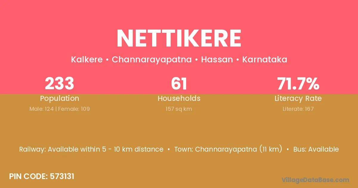Kunigal (20 km) is the nearest town to Nettikere village for major economic activities and is located approximately 20 km away.