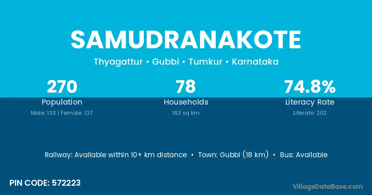Gubbi (18 km) is the nearest town to Samudranakote village for major economic activities and is located approximately 18 km away.