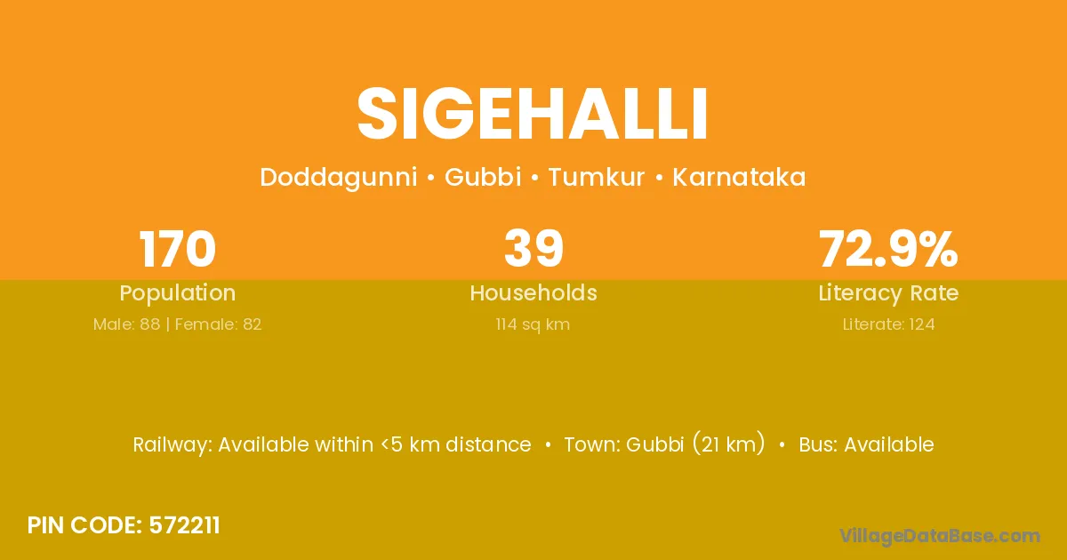 Gubbi (21 km) is the nearest town to Sigehalli village for major economic activities and is located approximately 21 km away.