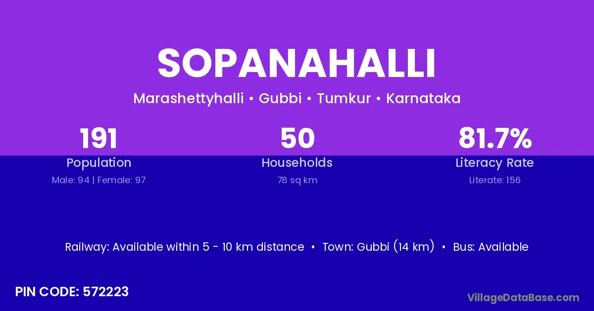 Gubbi (14 km) is the nearest town to Sopanahalli village for major economic activities and is located approximately 14 km away.