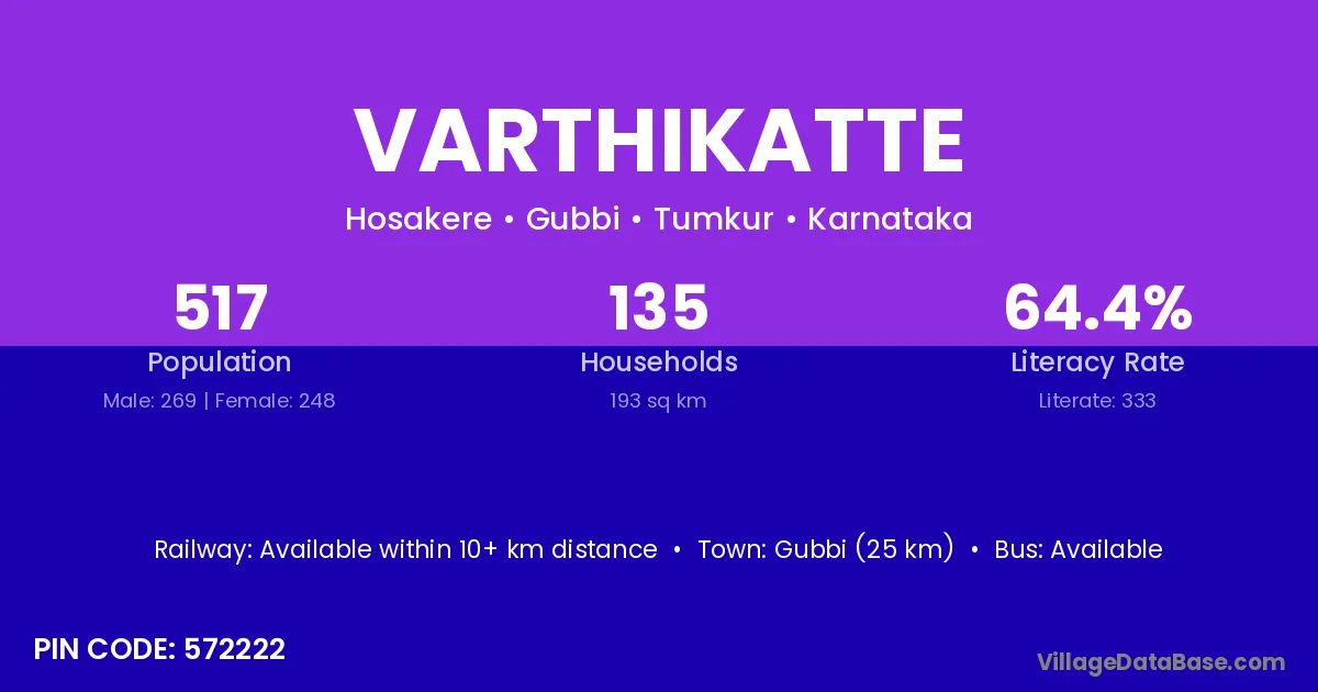 Gubbi (25 km) is the nearest town to Varthikatte village for major economic activities and is located approximately 25 km away.