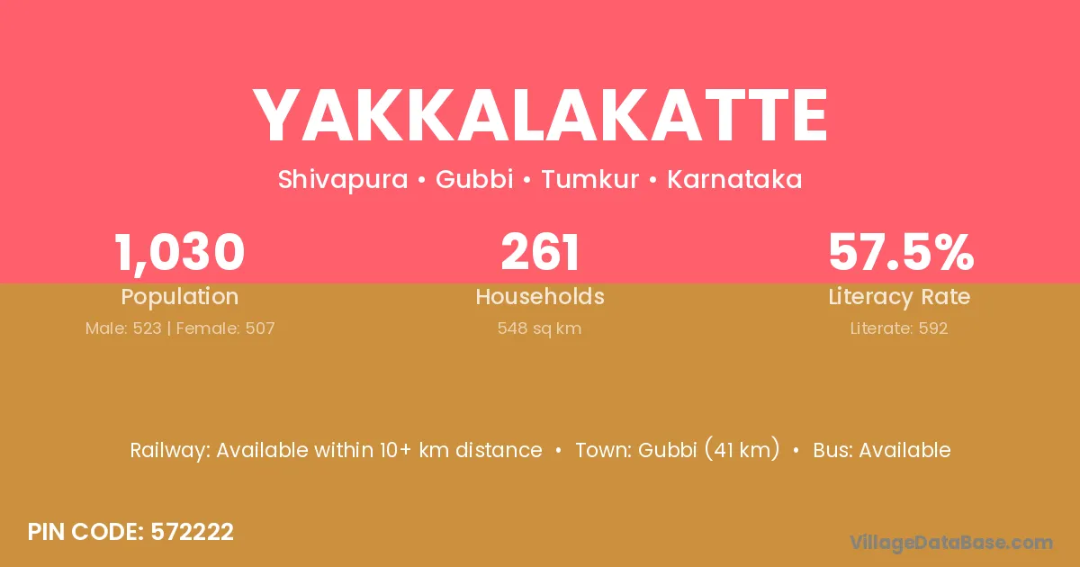 Yakkalakatte village has a total population of 1,030 people, of which 523 are males and 507 are females.