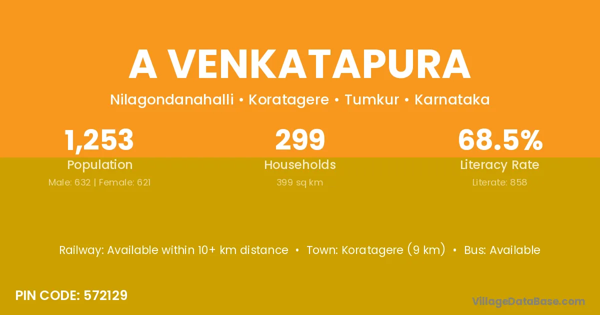 Koratagere (9 km) is the nearest town to A Venkatapura village for major economic activities and is located approximately 9 km away.