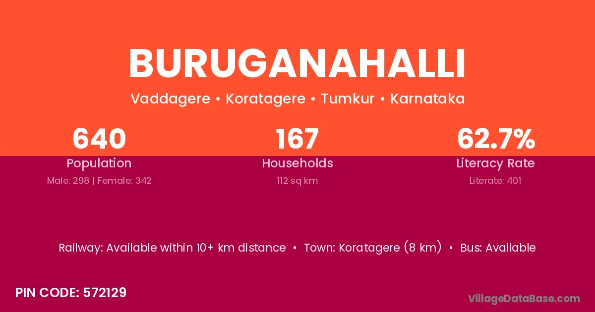 Koratagere (8 km) is the nearest town to Buruganahalli village for major economic activities and is located approximately 8 km away.