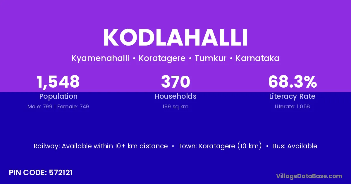 Koratagere (10 km) is the nearest town to Kodlahalli village for major economic activities and is located approximately 10 km away.