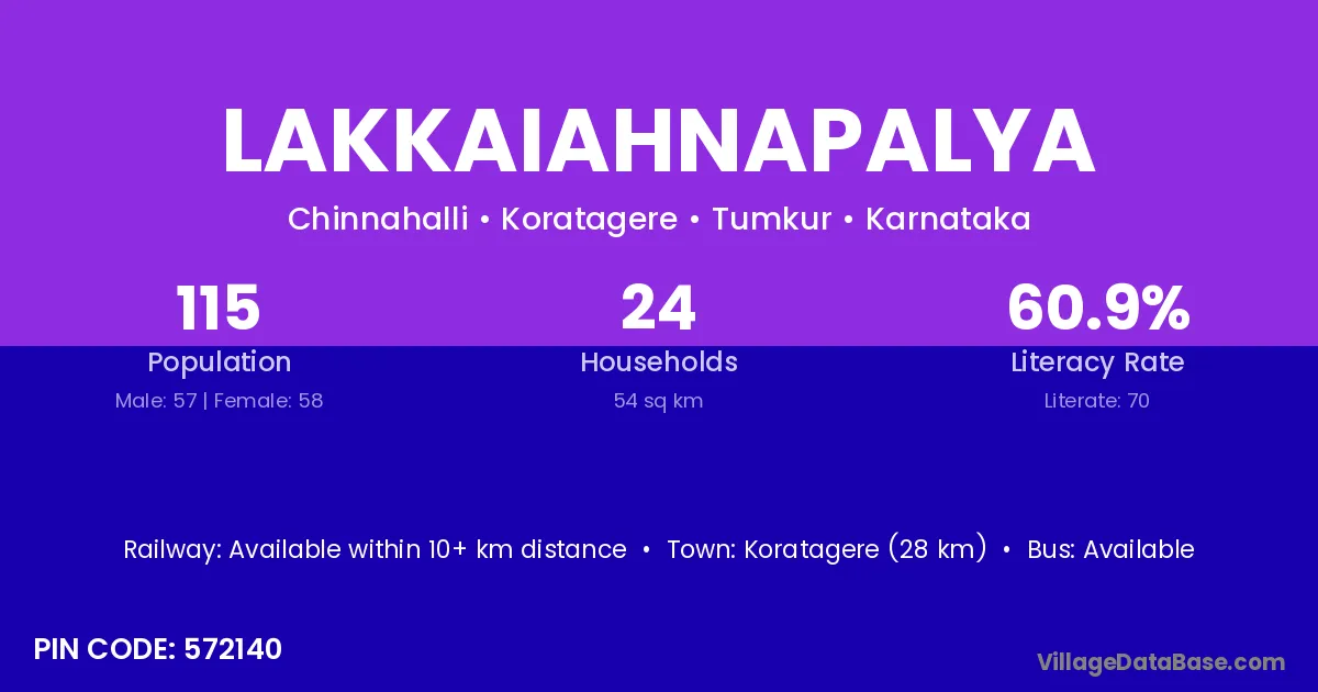 Lakkaiahnapalya village has a total population of 115 people, of which 57 are males and 58 are females.