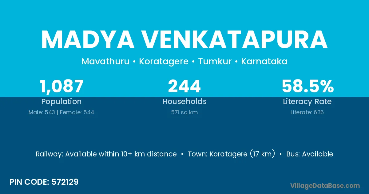 Koratagere (17 km) is the nearest town to Madya Venkatapura village for major economic activities and is located approximately 17 km away.
