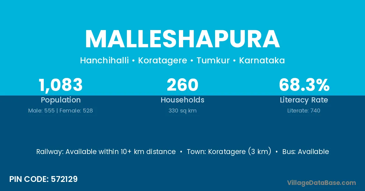 Malleshapura village has a total population of 1,083 people, of which 555 are males and 528 are females.