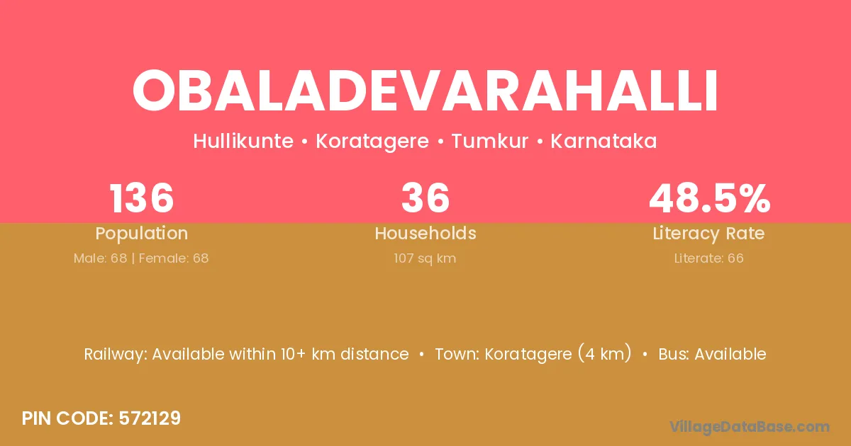 Koratagere (4 km) is the nearest town to Obaladevarahalli village for major economic activities and is located approximately 4 km away.