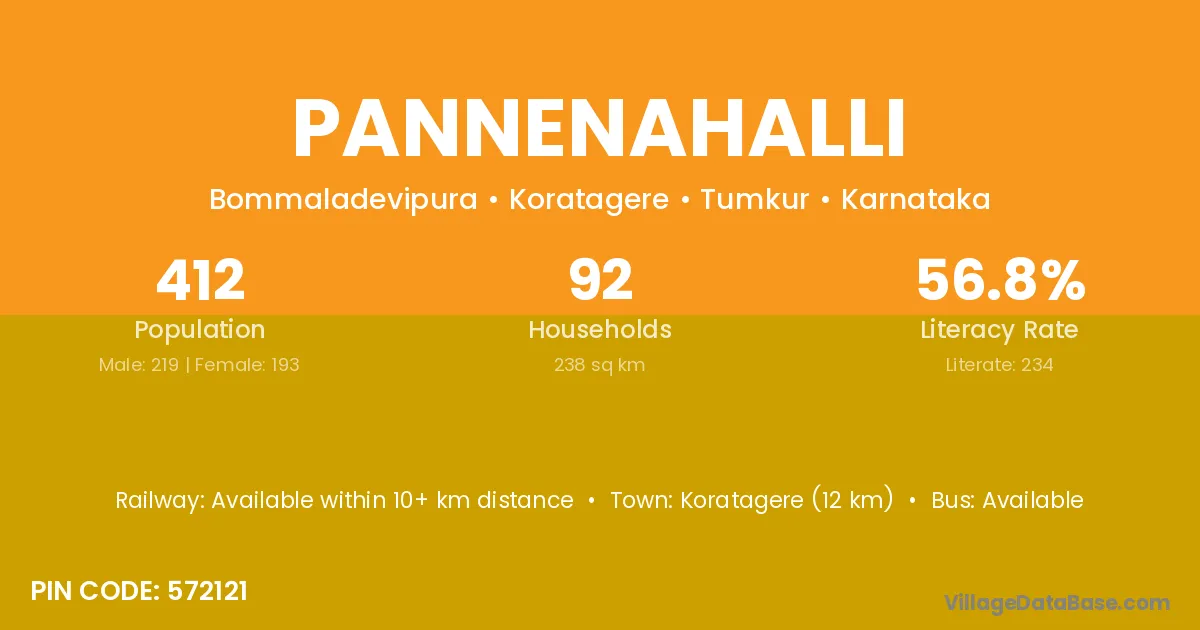 Koratagere (12 km) is the nearest town to Pannenahalli village for major economic activities and is located approximately 12 km away.