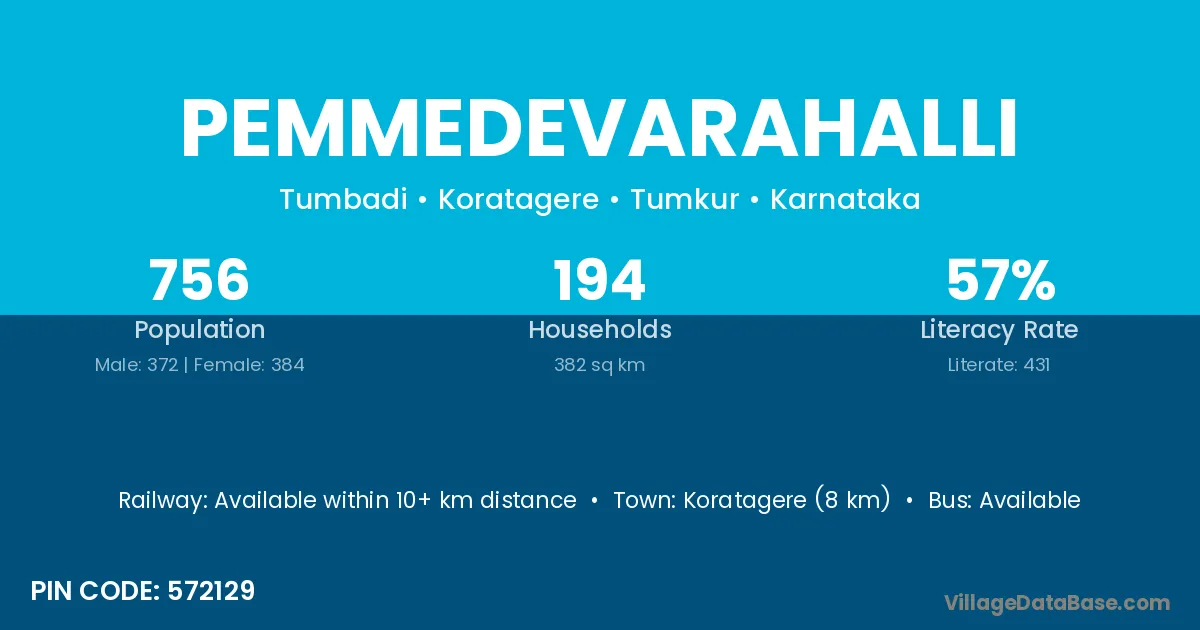 Koratagere (8 km) is the nearest town to Pemmedevarahalli village for major economic activities and is located approximately 8 km away.