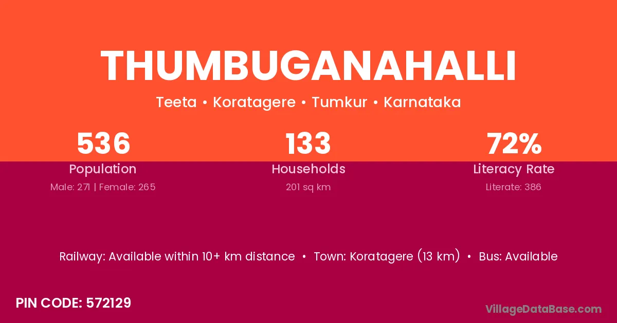 Koratagere (13 km) is the nearest town to Thumbuganahalli village for major economic activities and is located approximately 13 km away.