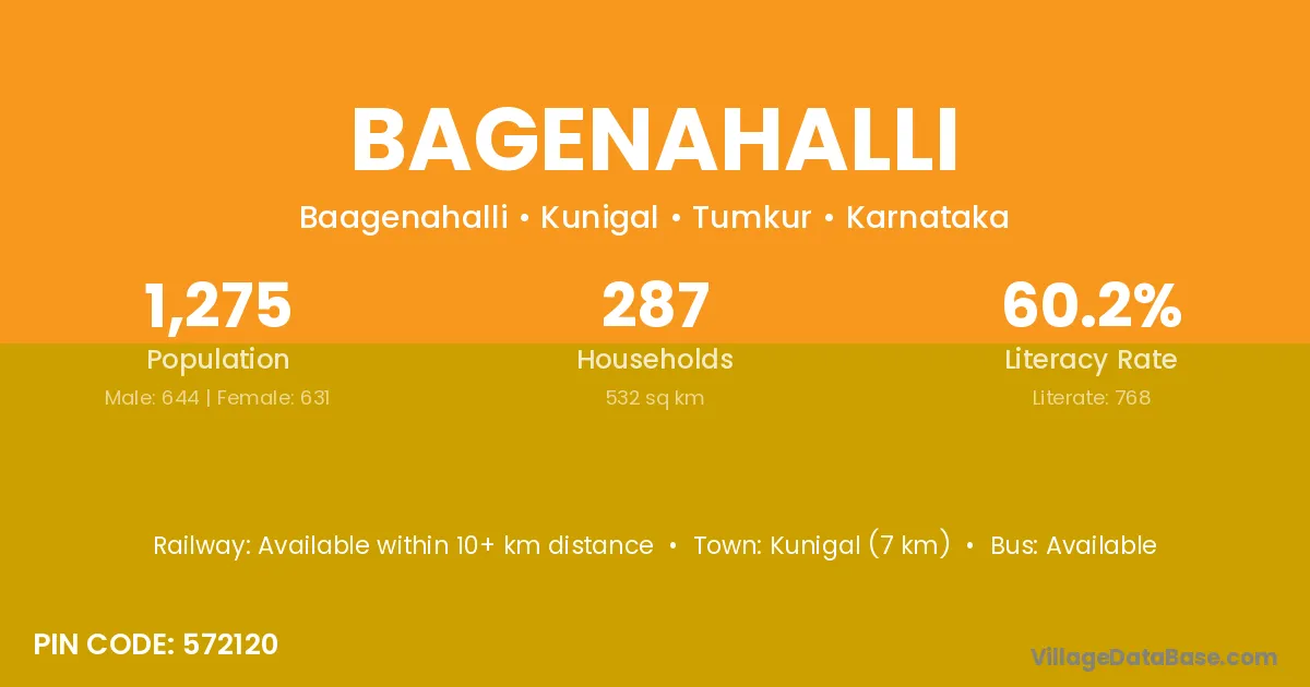 Kunigal (7 km) is the nearest town to Bagenahalli village for major economic activities and is located approximately 7 km away.