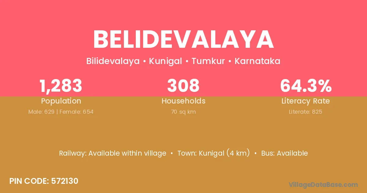 Kunigal (4 km) is the nearest town to Belidevalaya village for major economic activities and is located approximately 4 km away.