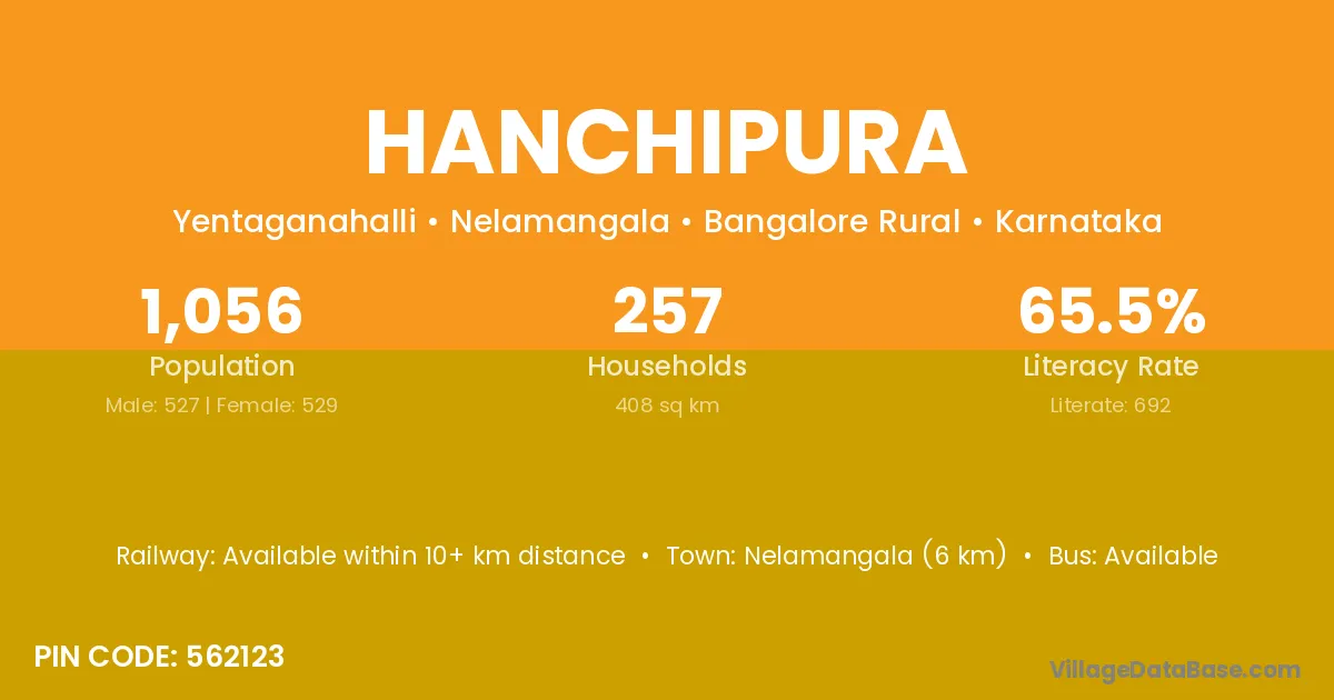 Kunigal (35 km) is the nearest town to Hanchipura village for major economic activities and is located approximately 35 km away.