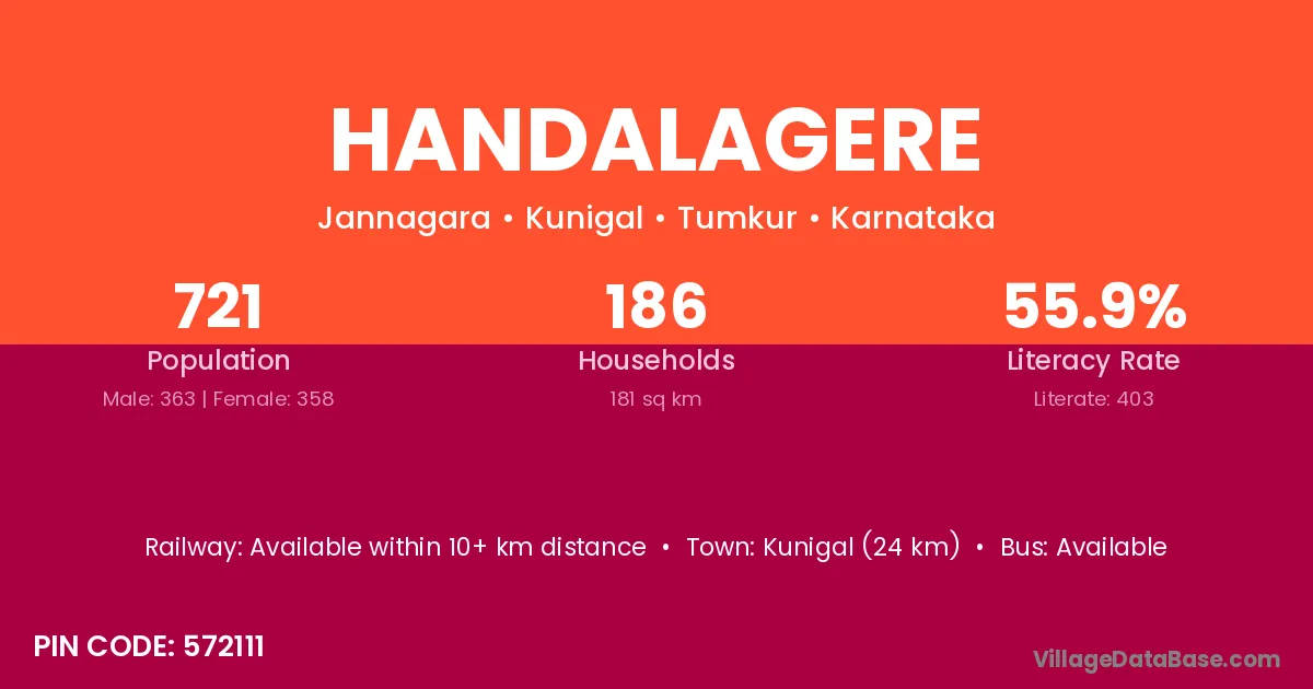 Kunigal (24 km) is the nearest town to Handalagere village for major economic activities and is located approximately 24 km away.