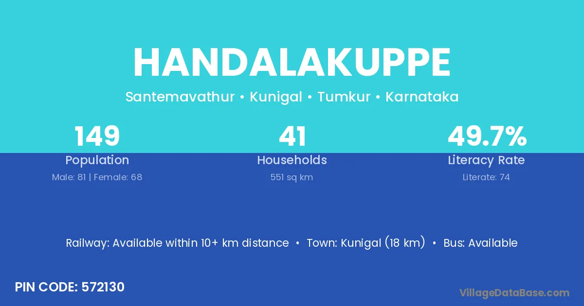 Kunigal (18 km) is the nearest town to Handalakuppe village for major economic activities and is located approximately 18 km away.